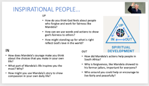 Our spirituality triangle is used throughout the curriculum, during worships and in restorative conversations to guide the children’s thinking. Below is an example of how our spiritual development triangle may be used to direct discussion. This one is based upon Nelson Mandela.