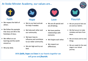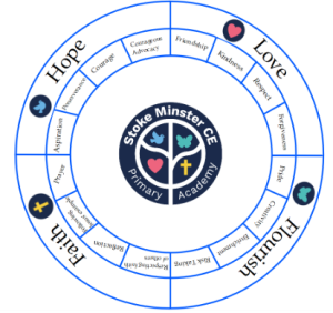 The schools vision is clear and articulated by all in our school community as a Christian way of belonging and flourishing together. Stoke Minster has four core values, our values enable us to grow and flourish to fulfill our God-given potential. Our values are faith, hope, love and flourish. Each of our values are represented by a symbol, which can be found on the school logo (which was designed by our children in 2022). If you look carefully, you can even spot the mustard tree in our logo!